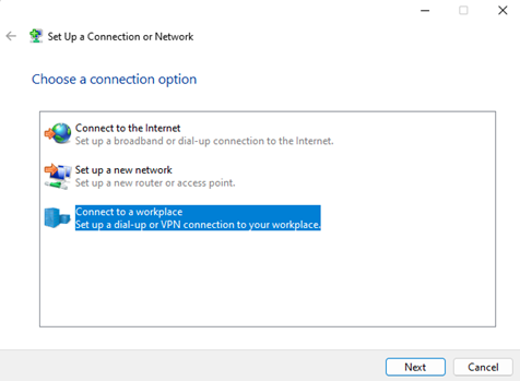 Selecione "Connect to a workplace" (Ligar a uma área de trabalho).