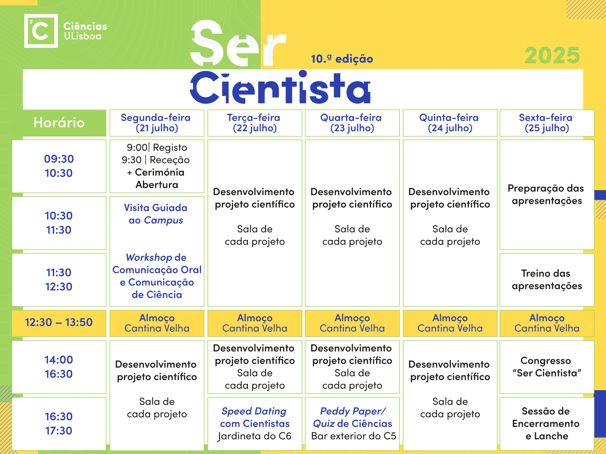 ✨ Programa de Verão 2025, de 21 a 25 de julho de 2025 Desafia-te! Ao longo de uma semana vais poder realizar, em grupo, um projeto científico acompanhado pelos docentes e investigadores da nossa Faculdade. Se frequentas neste ano letivo o 10º, 11º ou 12º ano de escolaridade, este programa é dirigido a ti! Vais poder conhecer a realidade da investigação científica pela integração no dia-a-dia dos cientistas de diferentes áreas científicas da Faculdade de Ciências. O Ser Cientista conta já com nove edições, tendo recebido perto de 500 participantes desde a primeira edição. | | |