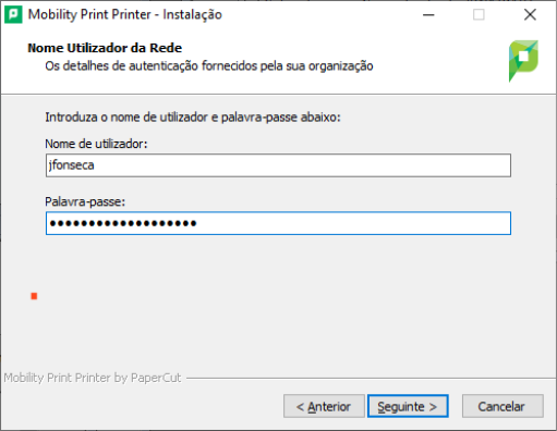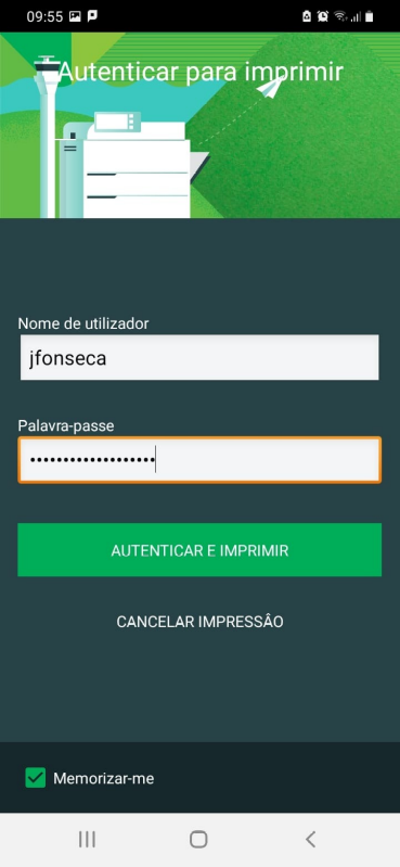 O login e password serão solicitados sempre que seja enviada uma nova tarefa de impressão.