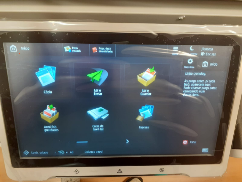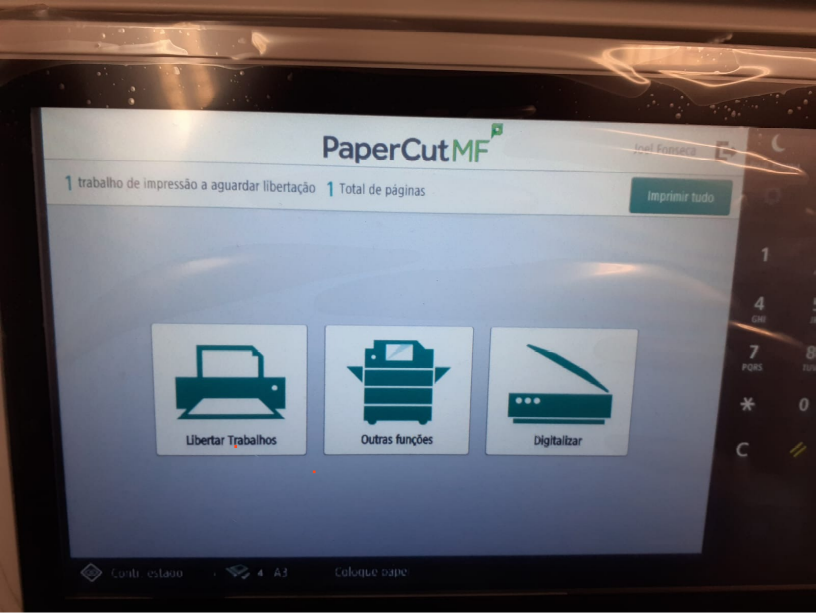 Após a autenticação é apresentado no ecrã um menu que permite libertar trabalhos de impressão, digitalizar e realizar outras funções