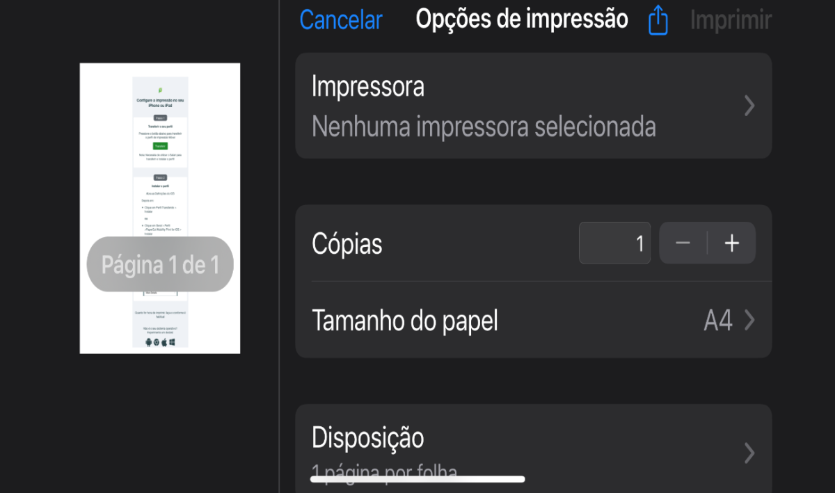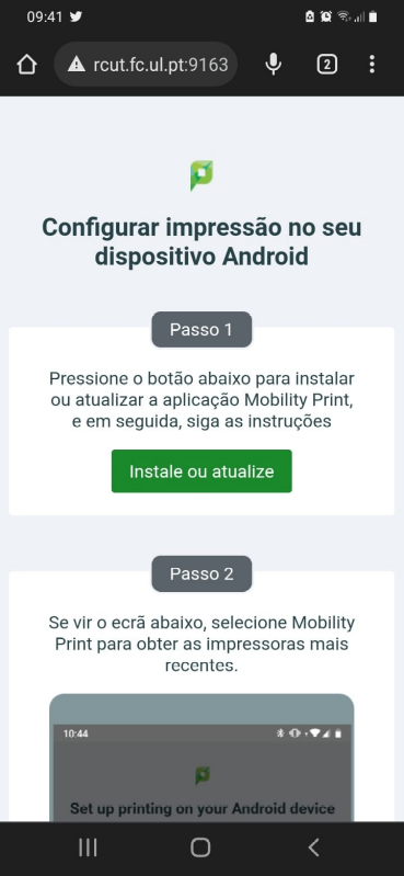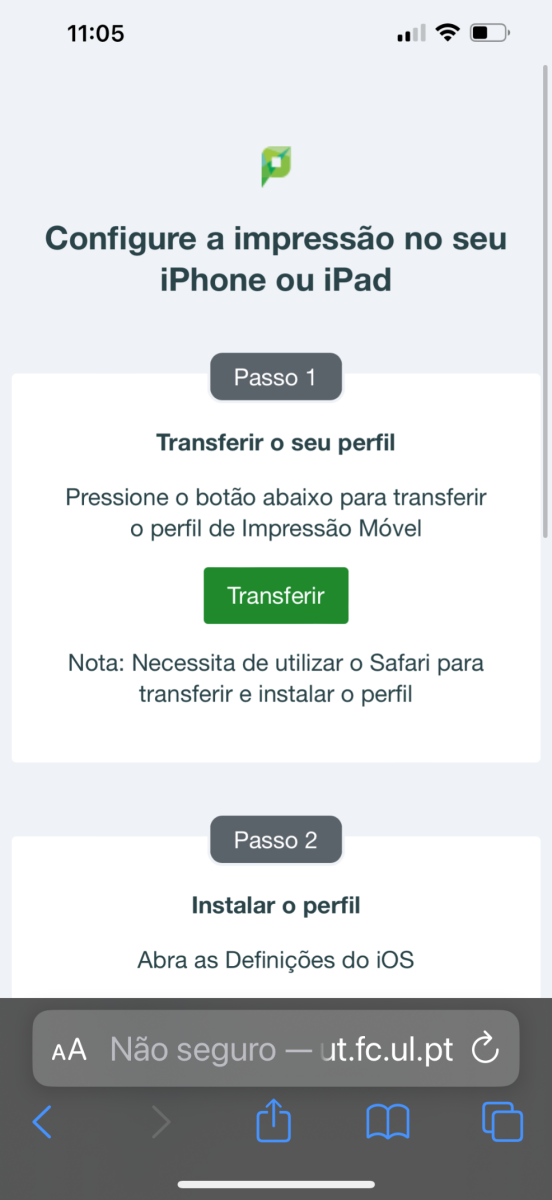 Instalar o perfil, nas definições do IOS - ->Abrir o separador Geral - -> Abrir Gestão de Dispositivos e VPN - -> Abrir o perfil descarregado “Papercut Mobility Print for IOS” e selecionar Instalar: