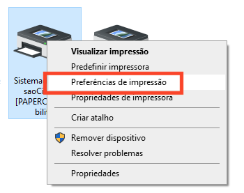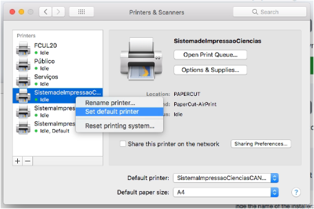 Escolher o SistemaDeImpressaoCiencias e, com o botão do lado direito do rato, selecionar Set default printer