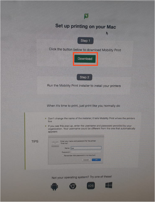 Clique no Download para fazer o download do cliente do Mobility Print para Linux: