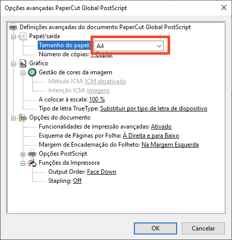 Para definir o tamanho do papel, clicar na opção Avançadas e escolher "A4" no tamanho do papel: